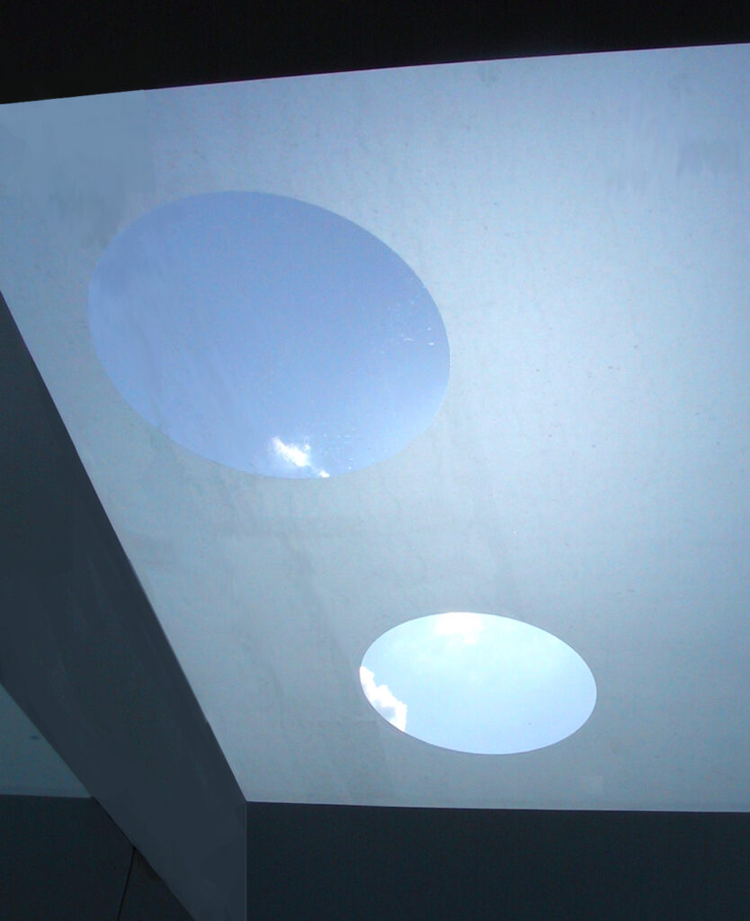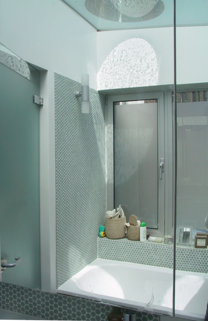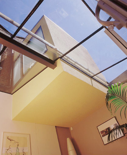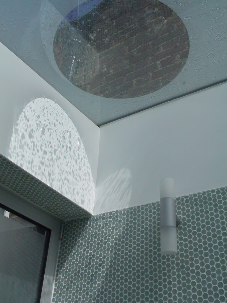 The bathroom has an acid etched glass roof with clear circular openings, casting patterns of light through and out of the room into the hall and to the ground floor. The garden room has large sliding doors which open both sides of the room to the garden.