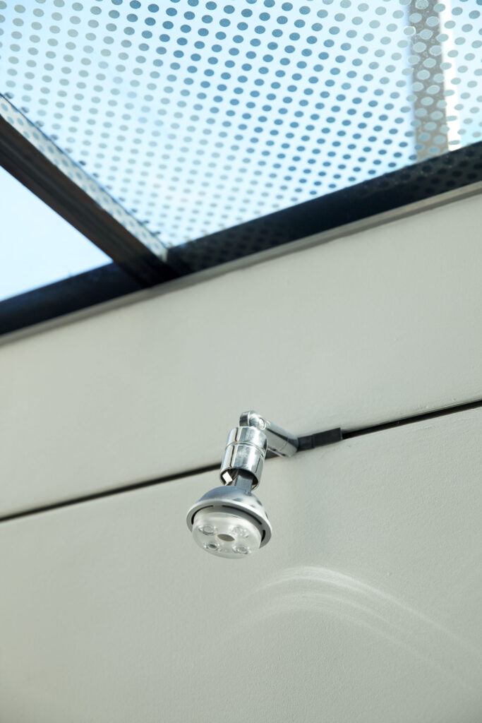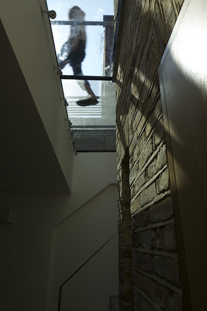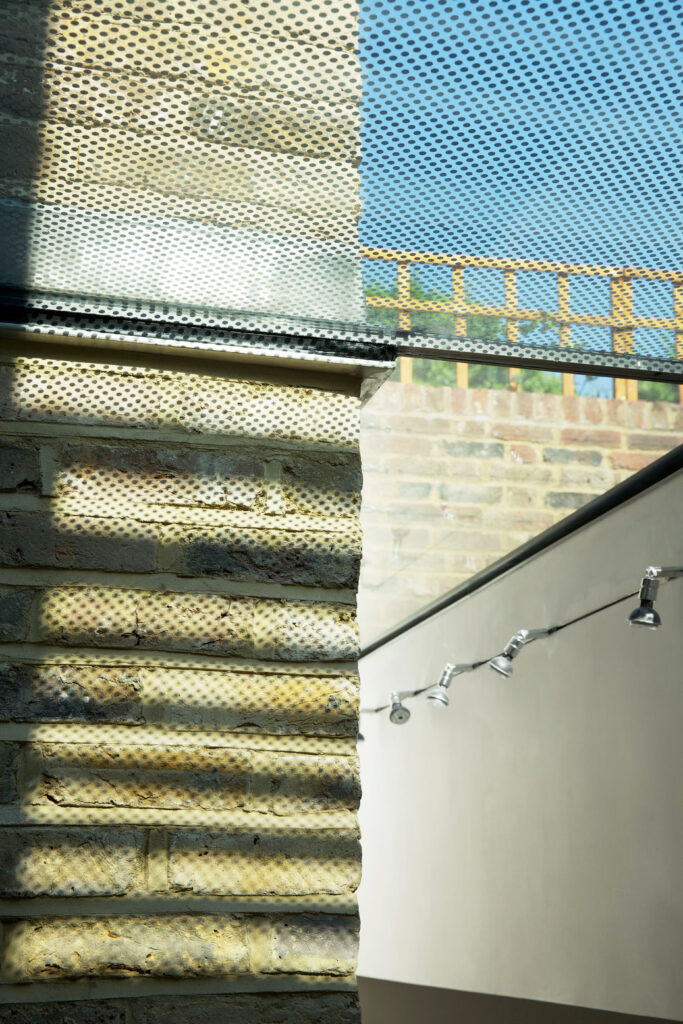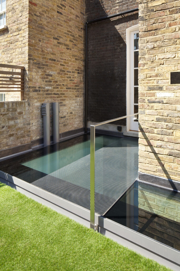 By separating the garden completely from the house, this extruded masonry box is expressed vertically through fritted structural glazing that makes a bridge for access from the ground level to the walled garden; and the southerly aspect allows angled sun to penetrate the new lower level throughout the day.