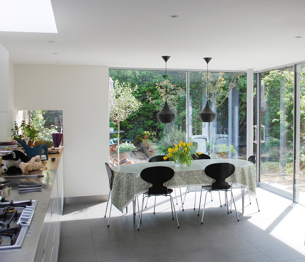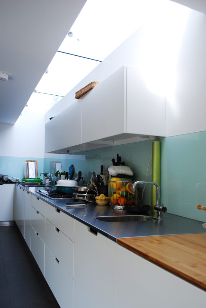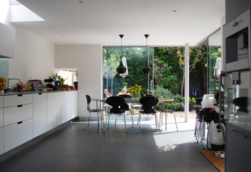 A restrained contemporary addition is introduced to a traditional English setting of mature roses and London stock brick. Modern construction methods allowed a high standard of accommodation that could be generously and naturally lit. The garden is brought right into the house with the careful positioning of full height sliding doors, and discrete skylights illuminate culinary endeavours in the new kitchen. Our client was delighted with our work: the kitchen functions as well as it looks; and a formerly underused space in the house has now become the centre of family life.