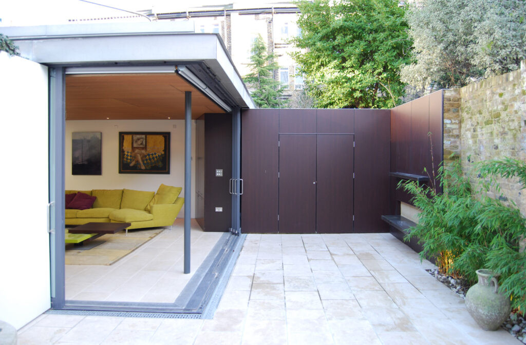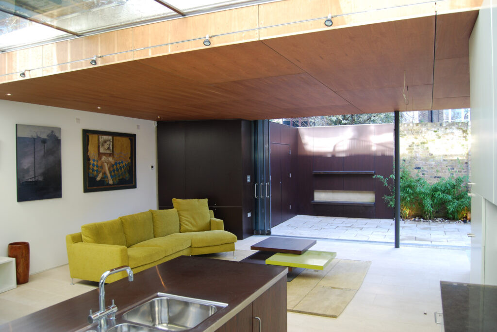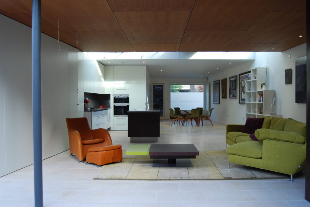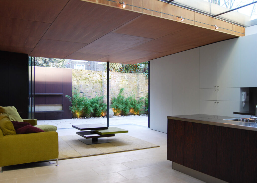 A sliding wall of glass at garden level retracts and disappears to allow the rear living room to flow seamlessly outside; the cupboard walls of the house snake out as continuous enclosing elements to enhance this reading, hiding garden storage, and making a wall that contains plants and a seat. Natural-stack ventilation, rainwater harvesting and full re-use and recycling of demolition materials complete the economical eco-credentials of the house.