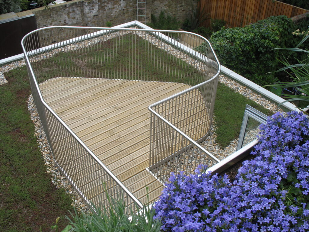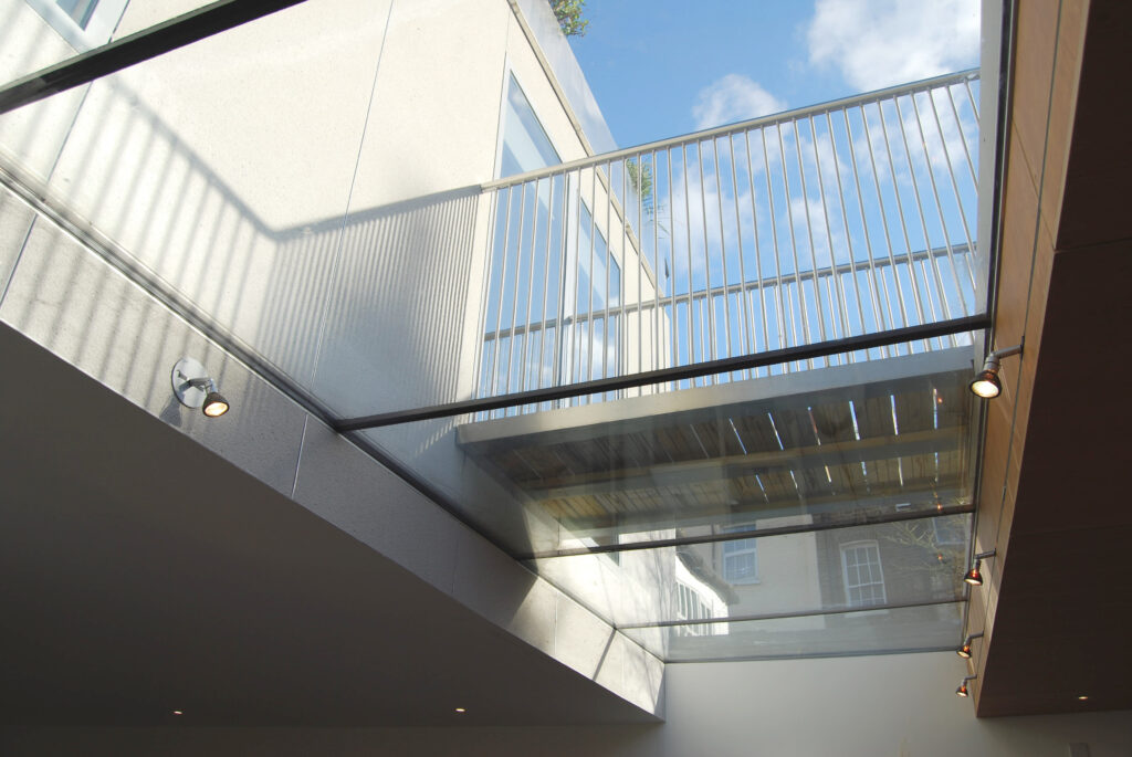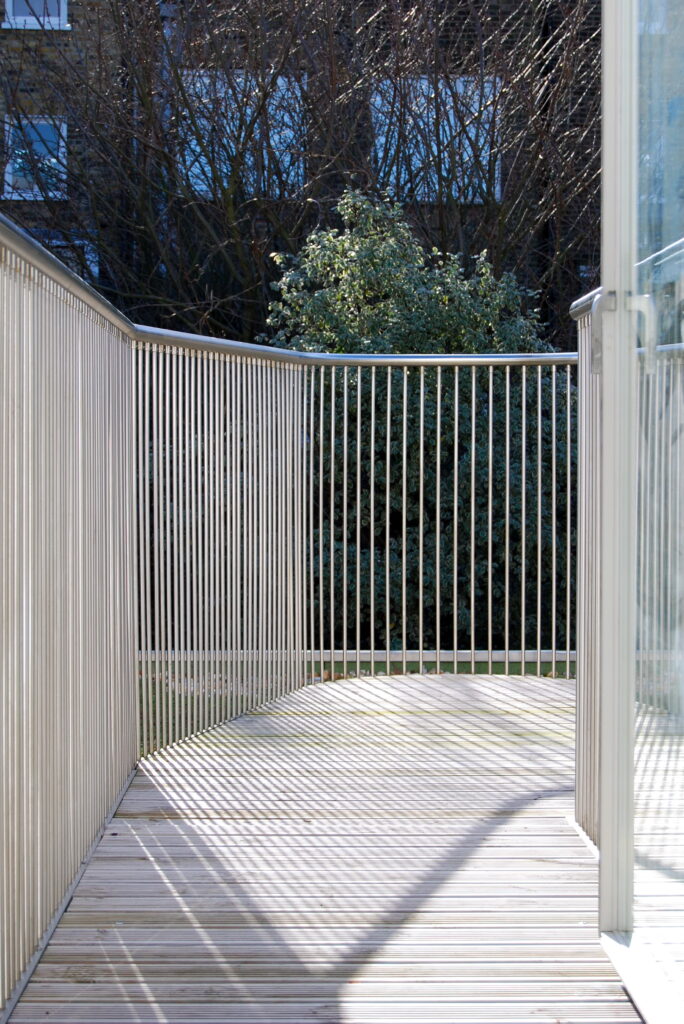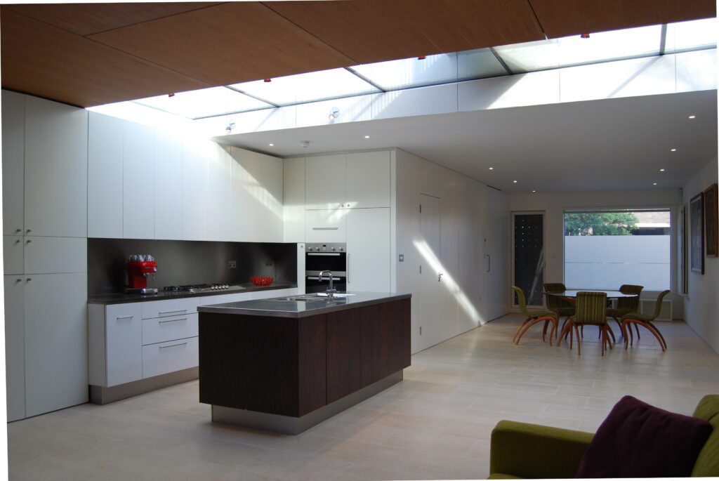 The ‘new-build’ house manages to add a new floor at roof level, pitched to the street with a structural-glass roof dormer and with a rear (south-facing) balcony off the master bedroom. Below this, a green roof is accessed from the 1st floor to the rear across a steel bridge and cam-shaped deck, a shape derived from neighbouring sight-lines suggested by Planning guidance. The bridge crosses a generous, full-width skylight that seems to float the plywood rear living room ceiling away from the main house.