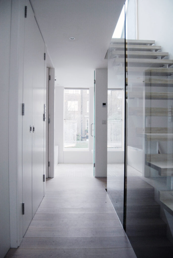 Modern interventions on the street are discreet, glass and metal in traditional shapes. At the rear, planted terraces (hanging gardens) cascade down in a radical reinterpretation that affords access without overlooking.Conceived like the ‘Tardis’, the house appears narrow, modest from the street, but at ground level opens to a huge modern-life space whose wall elements slide and wrap outside embracing the garden. To service this, the entrance and utilities are compressed behind a stretched wall, and a spiral cellar is hidden under the cathedral-stone floor.