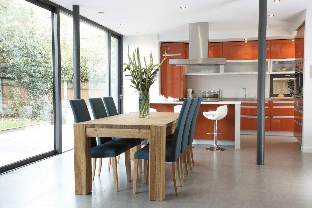 The new construction is of high quality materials and is sustainable using timber-frame construction. Two steel columns at ground floor continue the existing pine-trunk grid into the house from the garden.