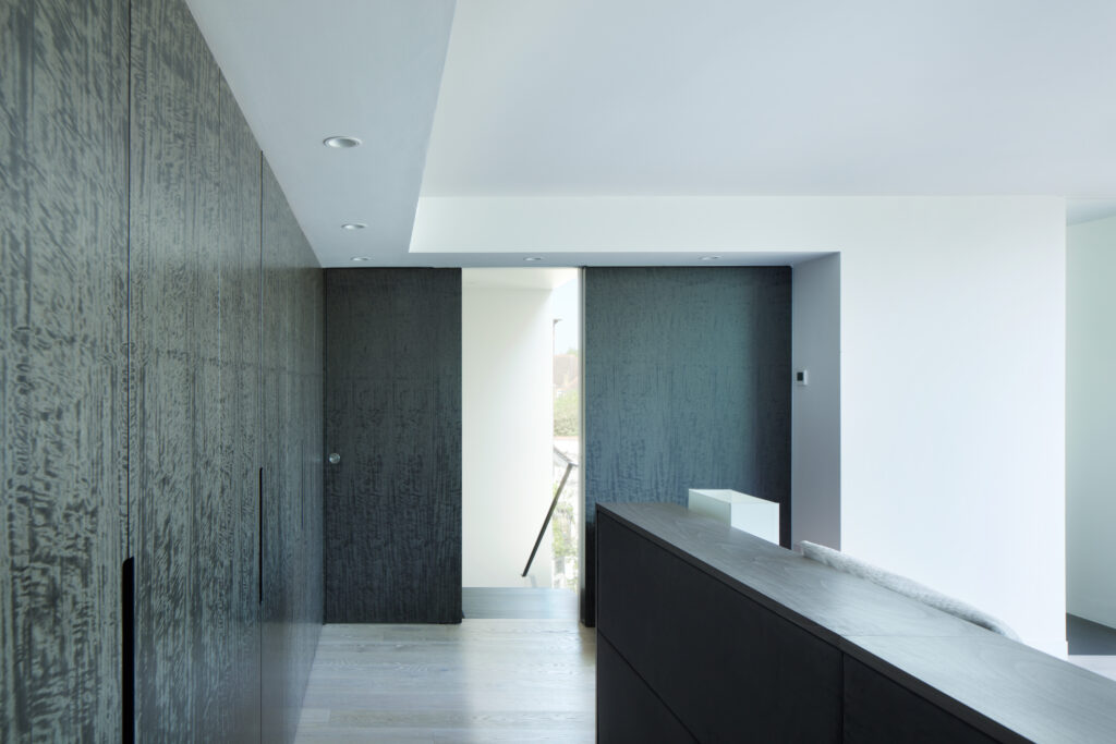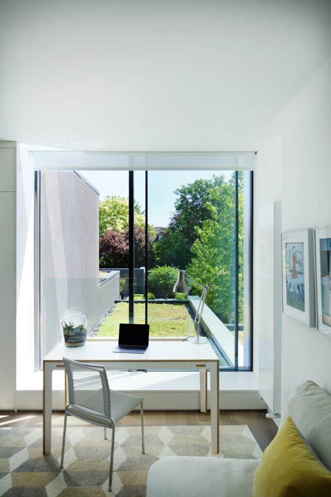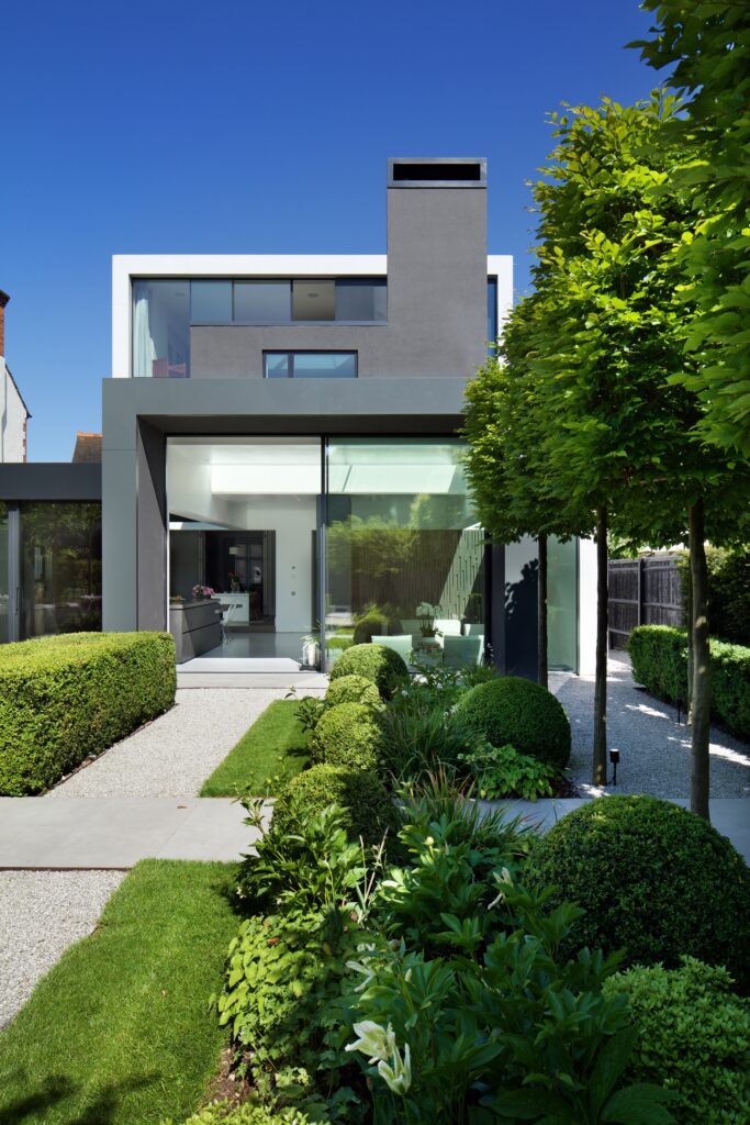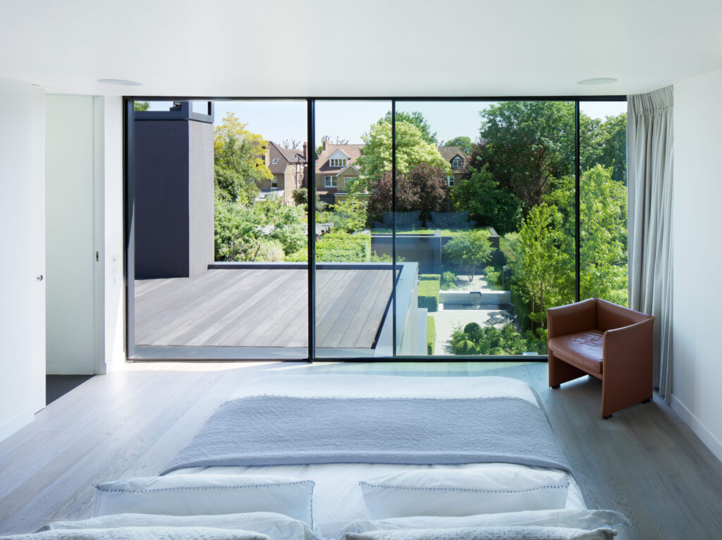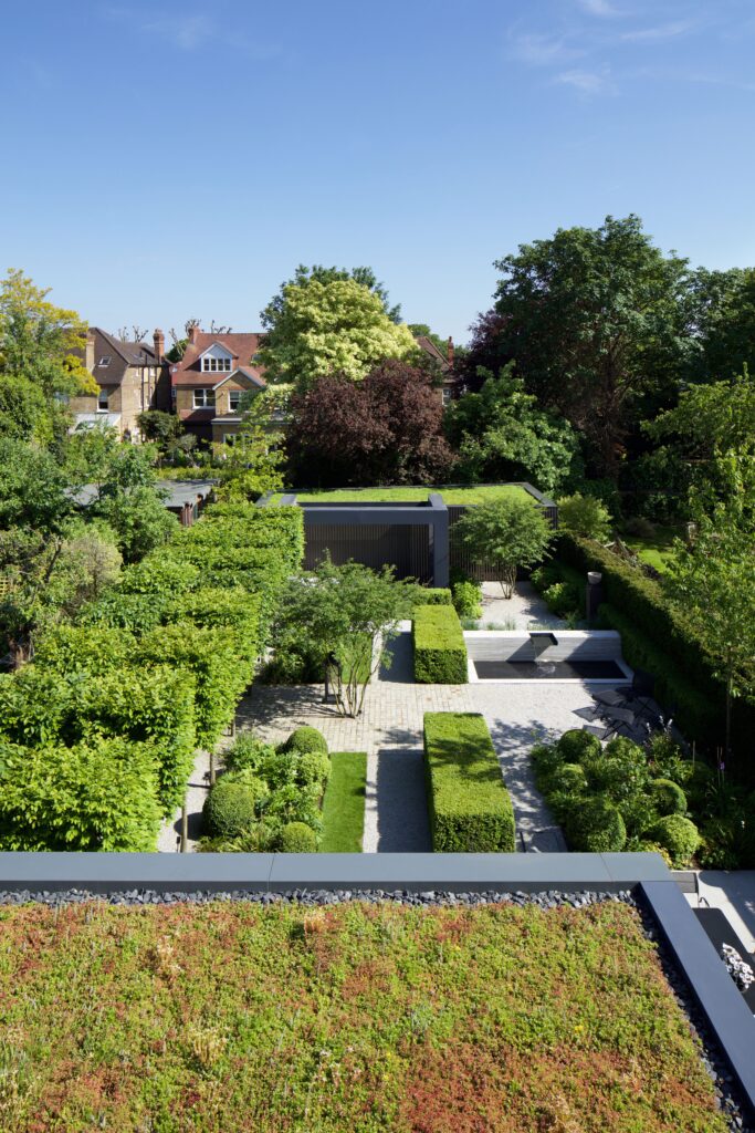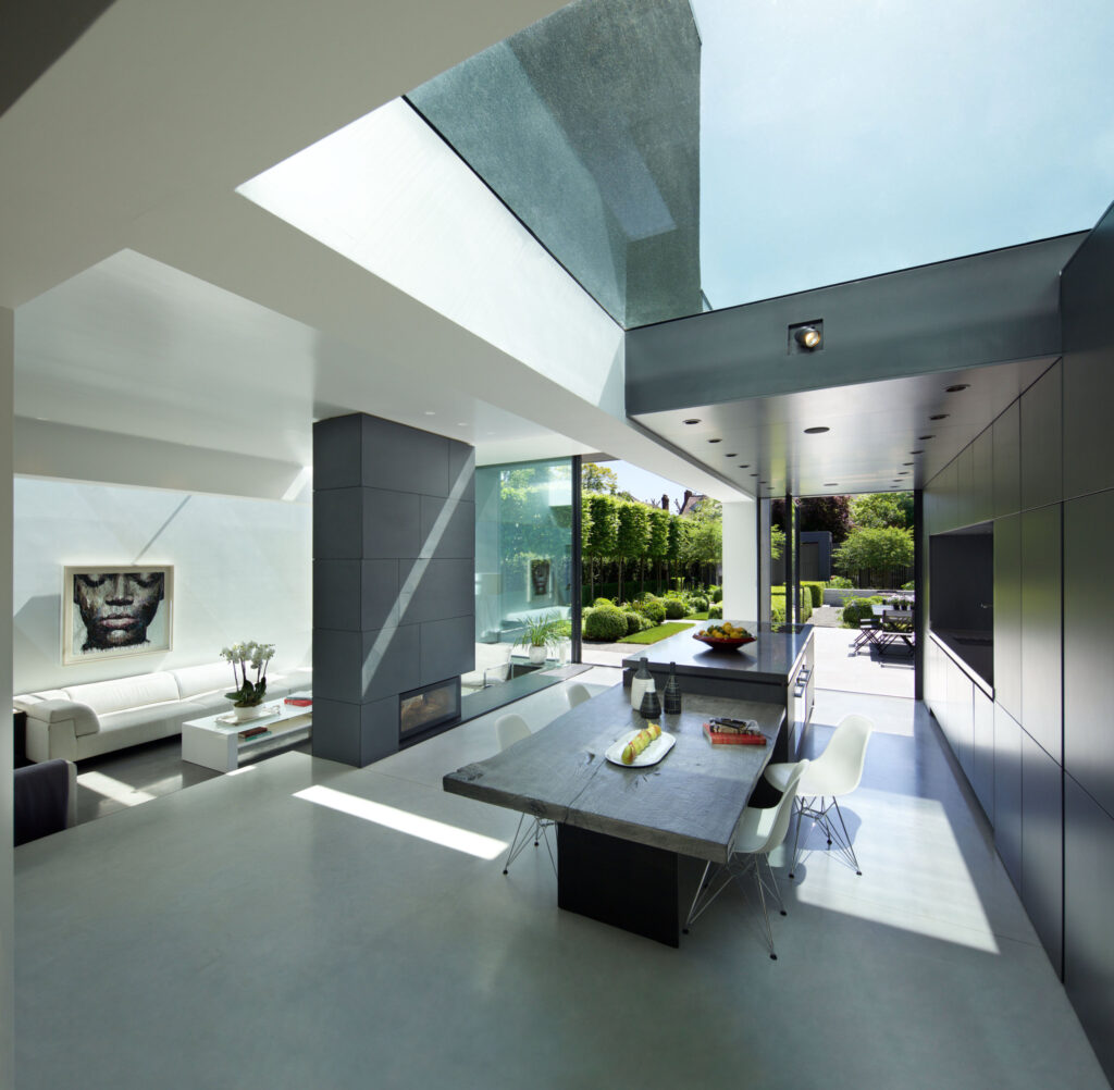 The ground-floor is opened up with a new staircase, while rear & side extensions create space for a generous, full-width, open-plan family living space (including kitchen and dining) opening to the rear garden and a giant landscaped courtyard -defined by a new pavilion annex at the far end. The existing garage is converted into an annex for visitors, and a grass-roofed studio/gym is housed in the pavilion. The resultant gives horizontal light-filled expansiveness to the house and opens the staircase and floors to landscape and sky.