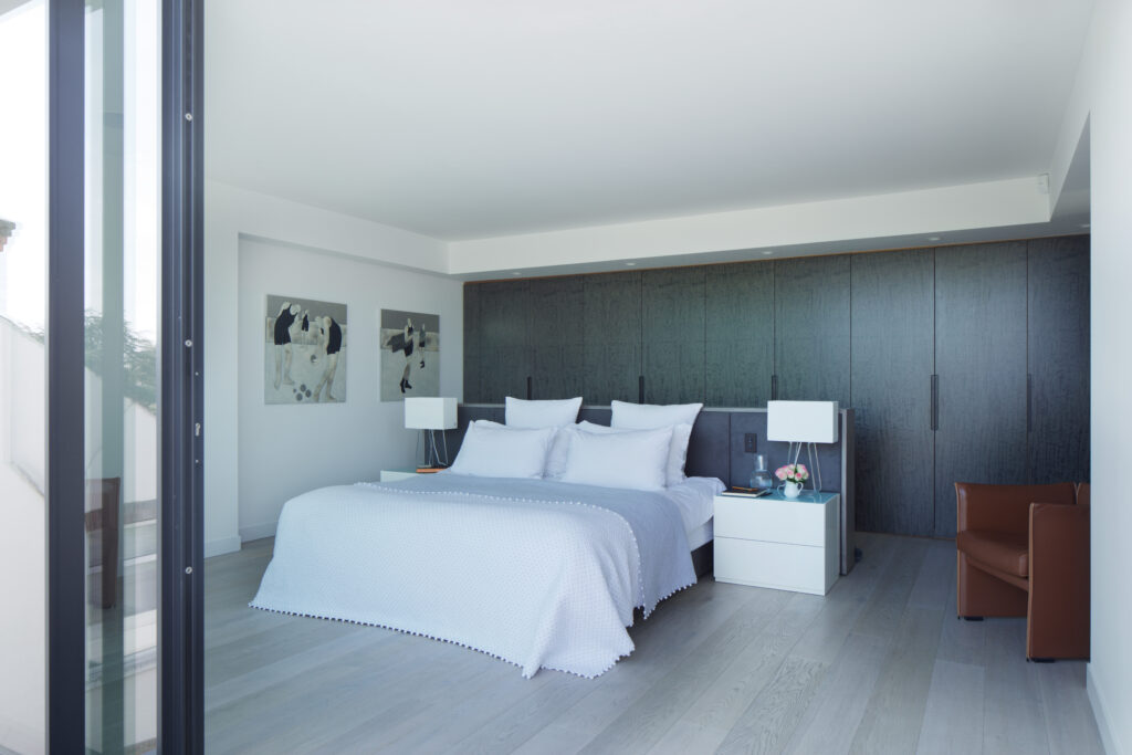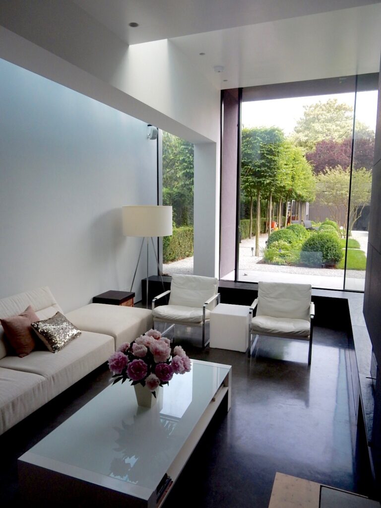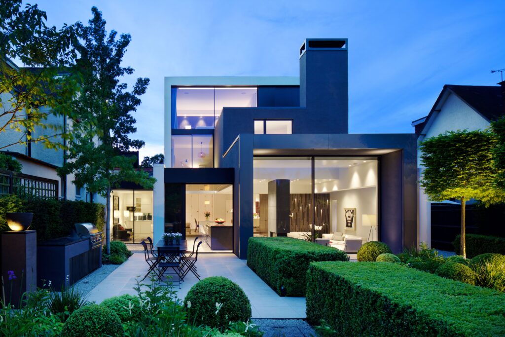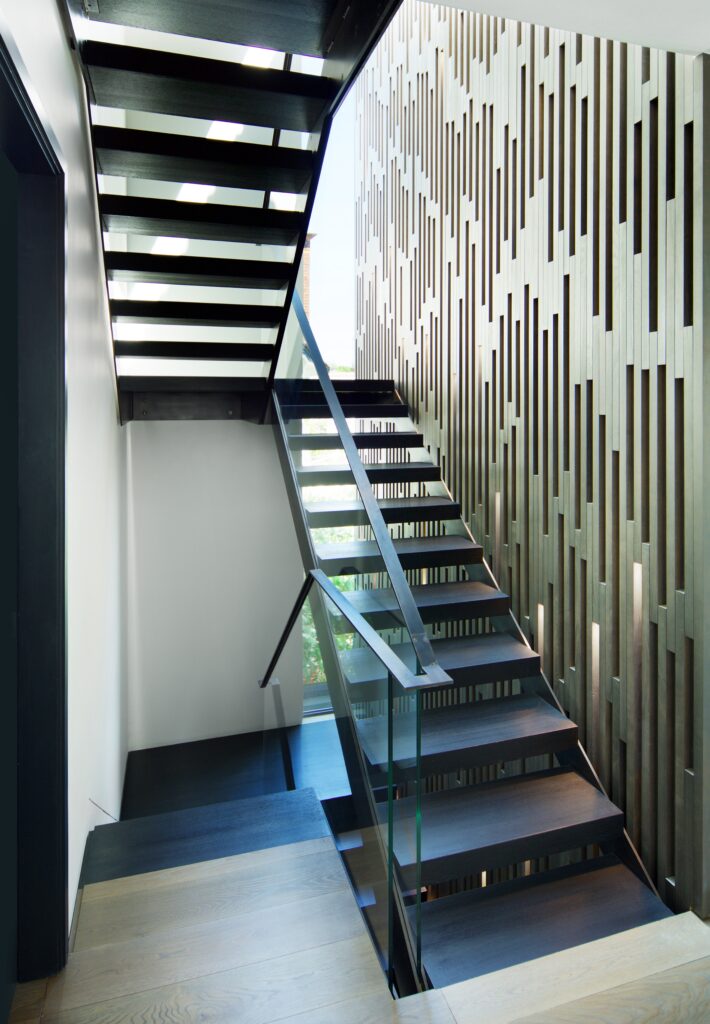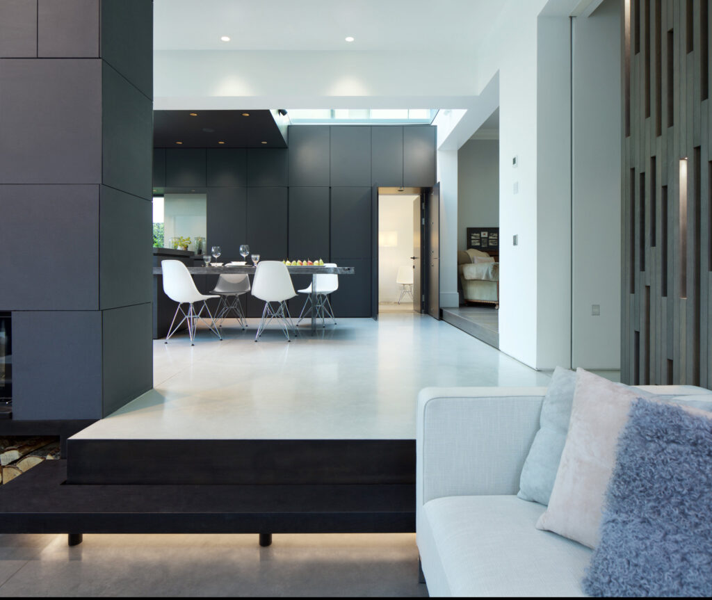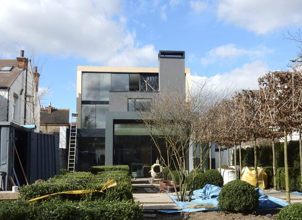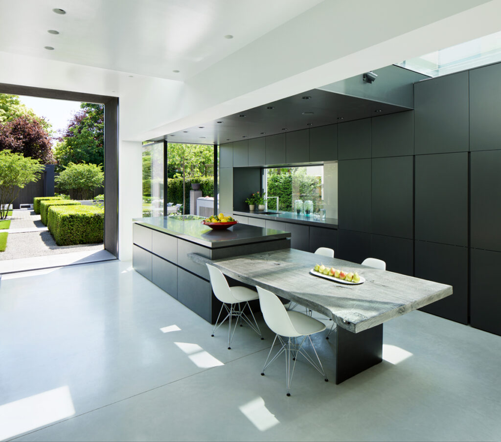 The ground-floor is opened up with a new staircase, while rear & side extensions create space for a generous, full-width, open-plan family living space (including kitchen and dining) opening to the rear garden and a giant landscaped courtyard -defined by a new pavilion annex at the far end. The existing garage is converted into an annex for visitors, and a grass-roofed studio/gym is housed in the pavilion. The resultant gives horizontal light-filled expansiveness to the house and opens the staircase and floors to landscape and sky.