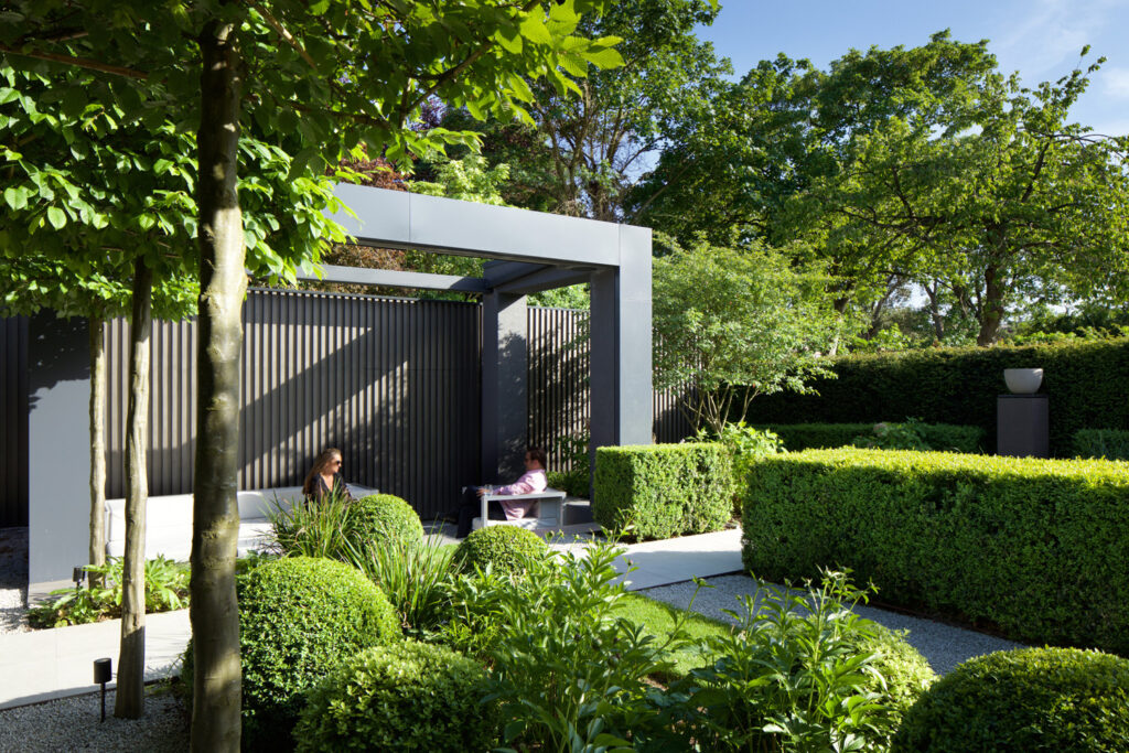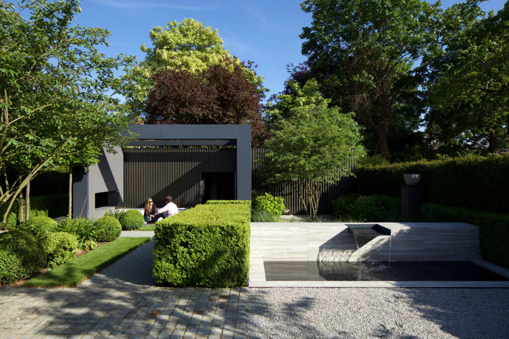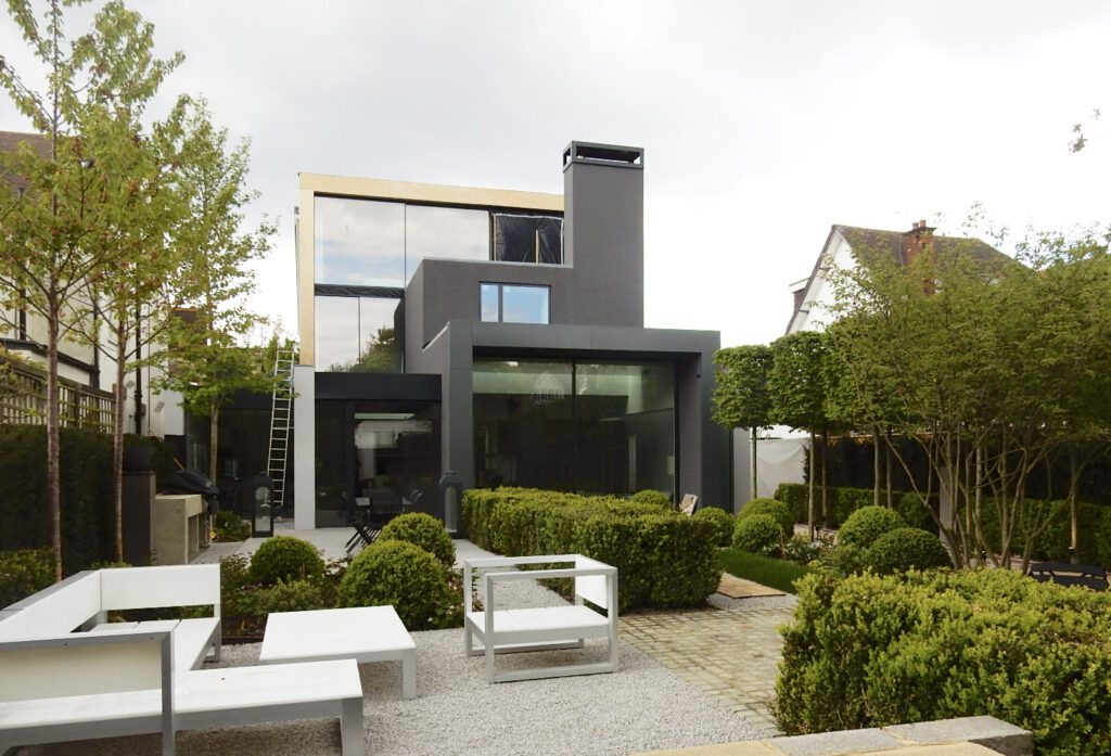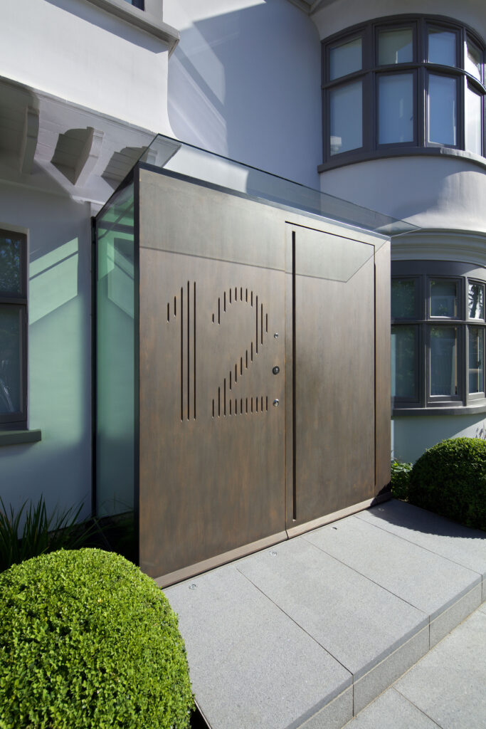 Externally, new porches on the original Arts & Crafts street-side façade hint at what can be found beyond. The rear of the building is a formalised cascade of grey modern boxes that reach to the landscape and terminate with the pavilion (that appears to have escaped to the bottom of the garden).
