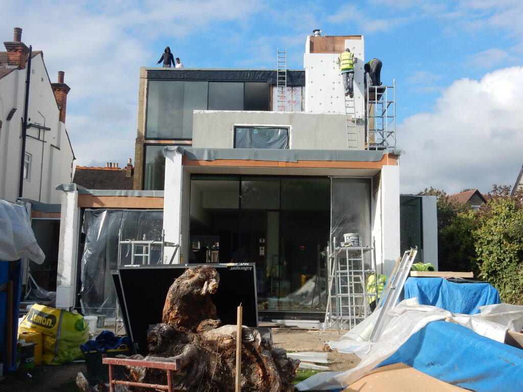 We were asked to re-imagine it to fit a modern family and embody the spirit of indoor/outdoor life-style into a British climate context. We quickly realised the budget wouldn’t allow a new build. Although not in a conservation area, the Planners resisted any major rearward expansion. We overcame this using our skill in permitted development to preserve and enhance 3 of the 4-square original layout, while rebuilding & expanding the fourth quadrant and bringing in the side garage. Internally, a loft extension accommodates a new master bedroom floor (with dressing room & en suite) and the first-floor internal walls are rearranged to integrate storage.