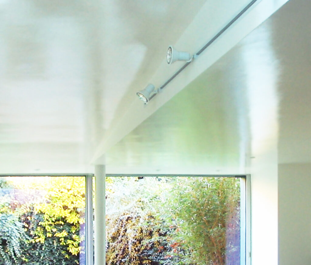 Externally, the extension is a simple extrusion of timber construction, clad in man-made slate panels, with the frameless glazed gap set flush to them both horizontally and vertically.