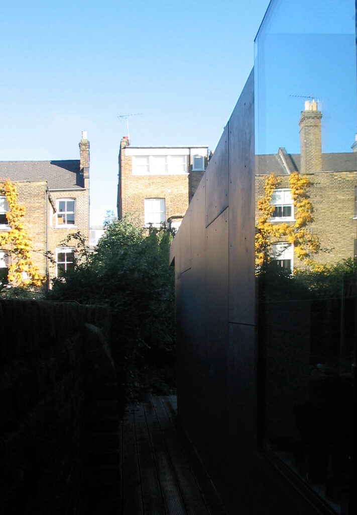 Light enters the new room from two sources: through full width sliding doors to the garden; and more importantly through a gap between the new box and the main rear wall of the house. This brings light deep into the plan of the room and into the remodelled spaces in the rear of the main house.